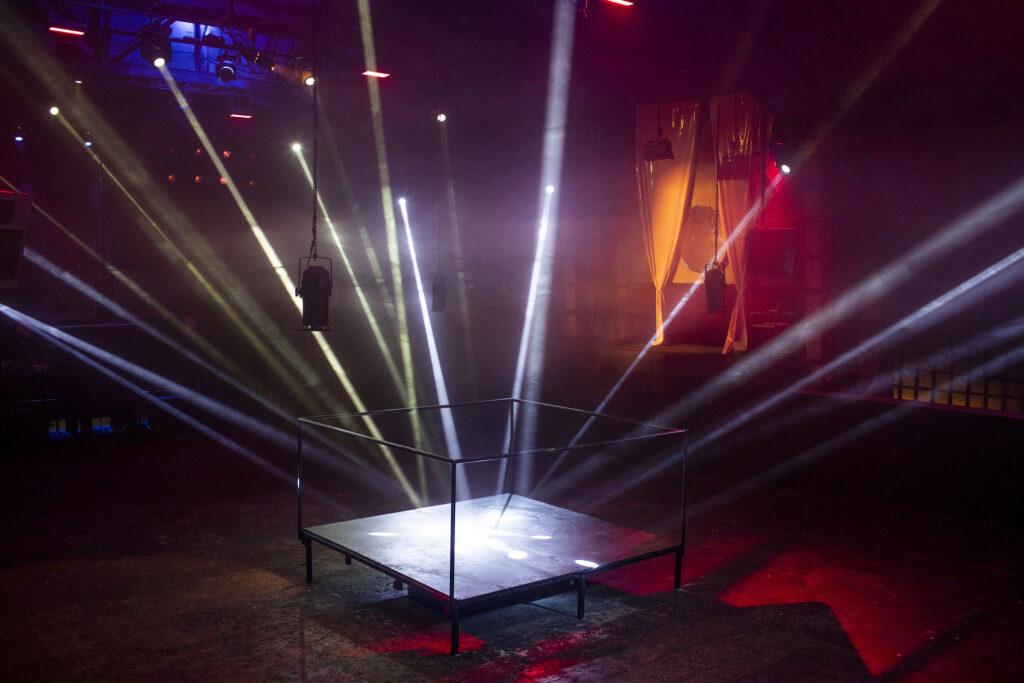 As I started moving, I began to notice the space around me more closely. Elevated platforms punctuated the room, steel pillars rising through them like poles, bodies circling, leaning, twirling. Lights appeared unpredictably, isolating a single dancer for a few seconds before disappearing again, revealing fragments of movement and passing shapes. The atmosphere was undeniably charged.